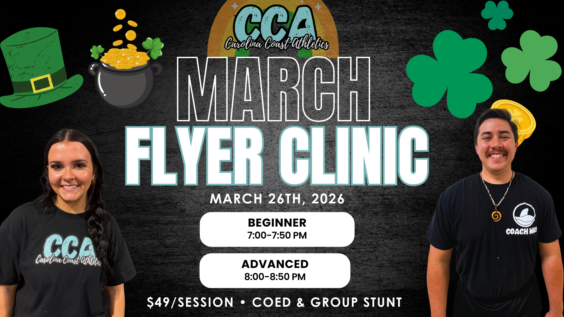 Our March Beginner Flyer Clinic is designed to help athletes grow confidence, strength, and control in the air—whether they’re learning the basics or polishing flying skills. Athletes will work on flyer technique, body positions, balance, flexibility, and performance confidence in a coed and group stunt environment. With focused instruction from experienced CCA coaches, athletes will...