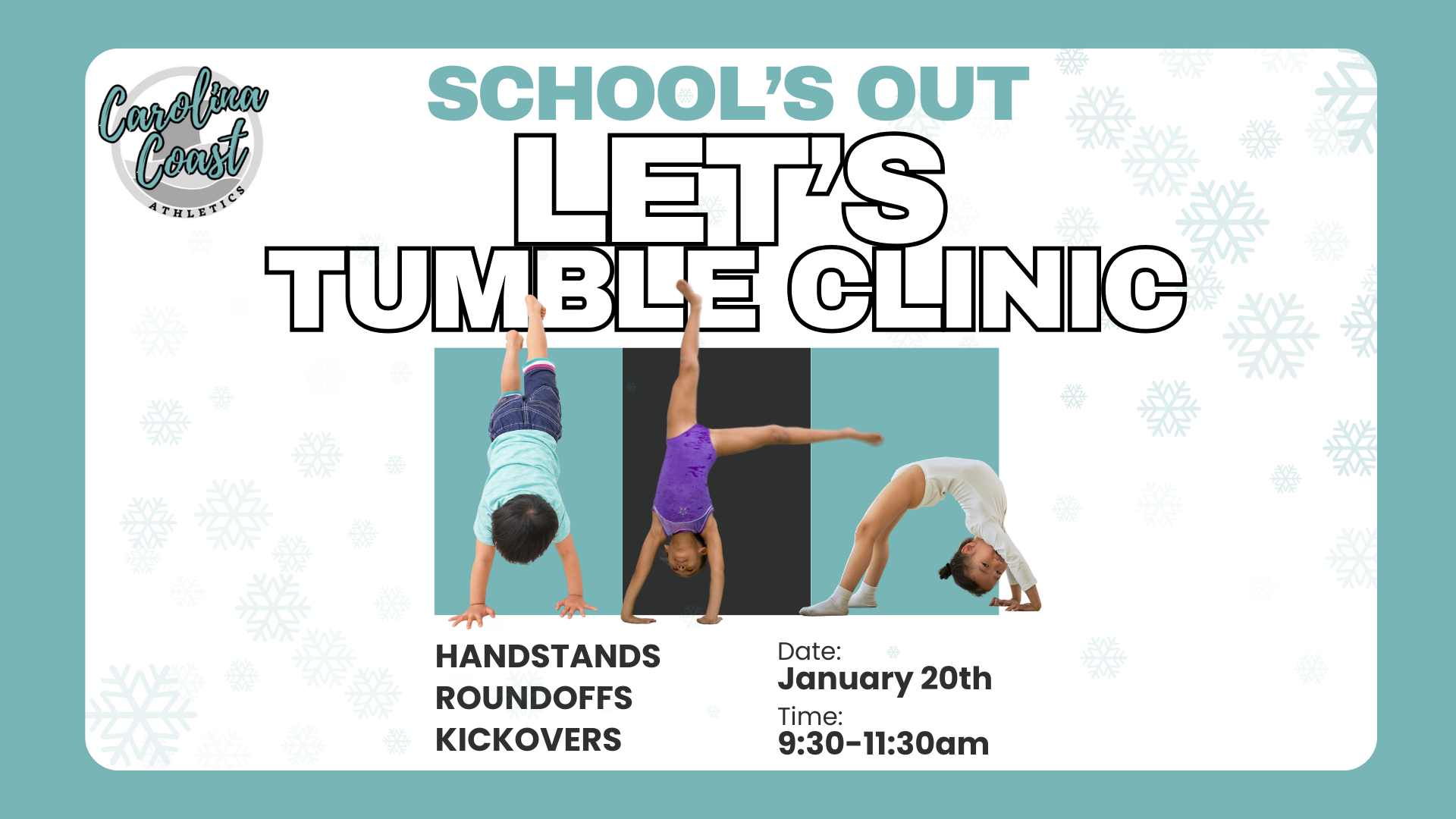 Make the most of your child’s Teacher Work Day with a focused tumbling clinic at Carolina Coast Athletics! This clinic is perfect for athletes looking to improve foundational tumbling skills in a fun, structured environment. Athletes will work on handstands, roundoffs, and kickovers, with emphasis on proper technique, strength, and confidence. Coaches will break skills...