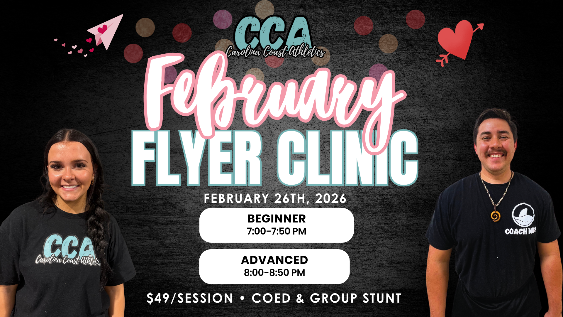 This special February Beginner Flyer's Clinic is designed to help athletes build confidence, technique, and strength in the air—whether they’re just getting started or ready to refine their skills. Athletes will work on proper flyer body positions, balance, flexibility, and confidence in a coed and group stunt setting, with focused instruction and hands-on feedback from...